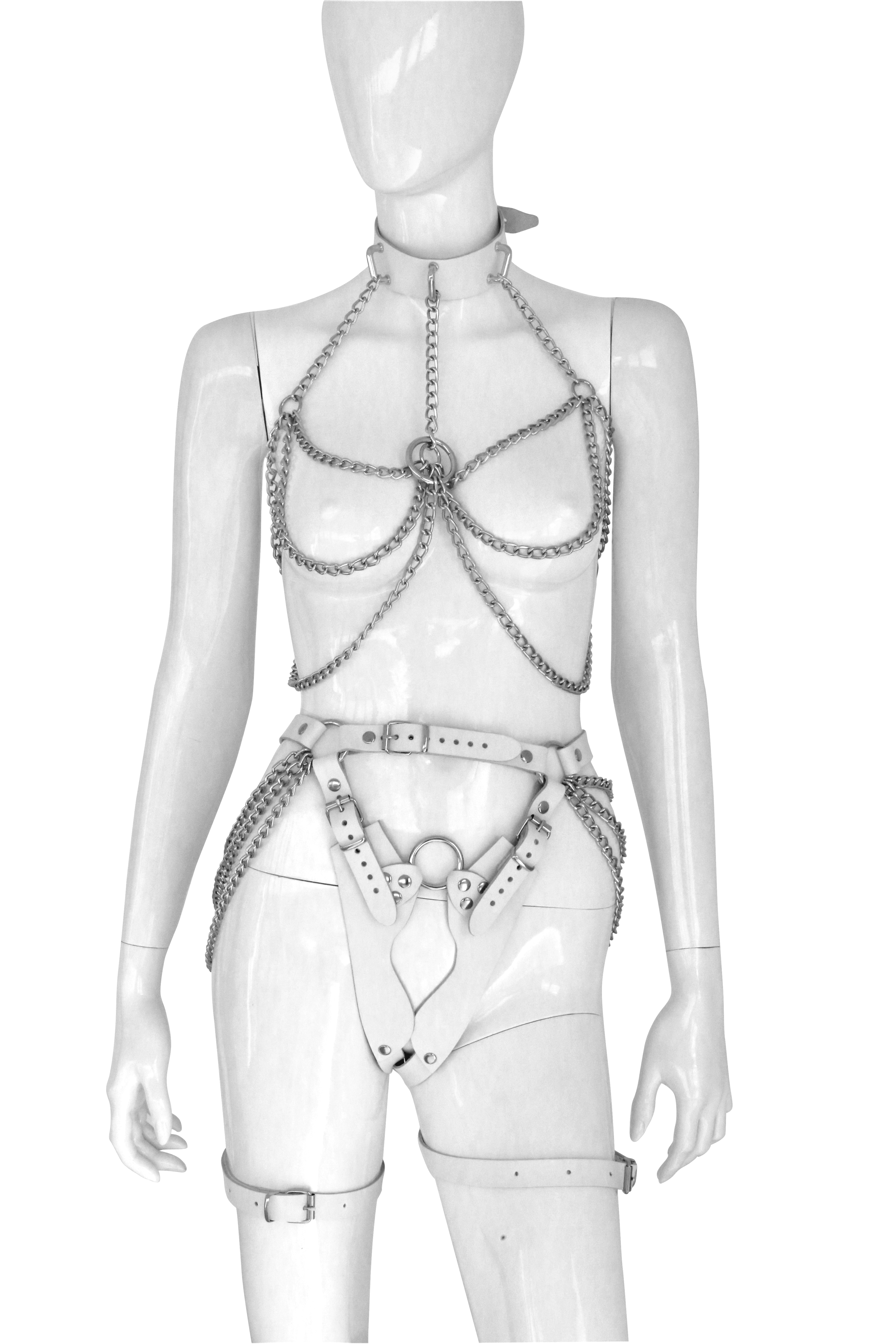 Body-Set aus rosafarbenem Leder mit silbernen Ketten.