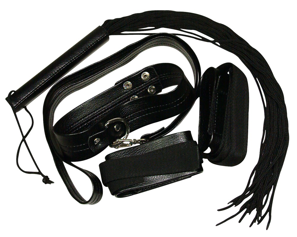 Schwarzes Bondageset, bestehend aus: Halsfessel mit Leine, Handfesseln mit Klettverschluss, Peitsche.
