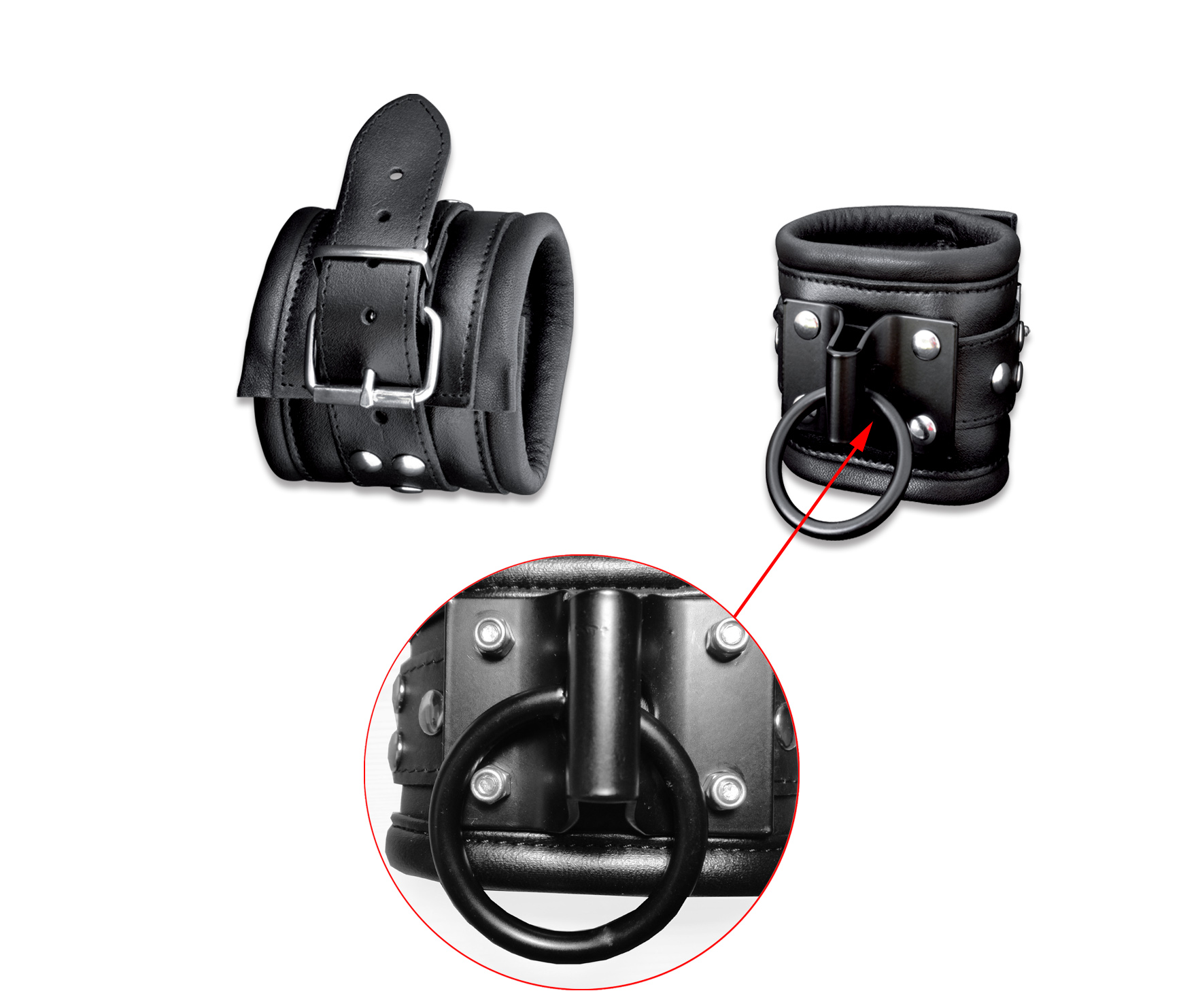 Leder Fesselset schwarz mit großen D-Ringen L-XL