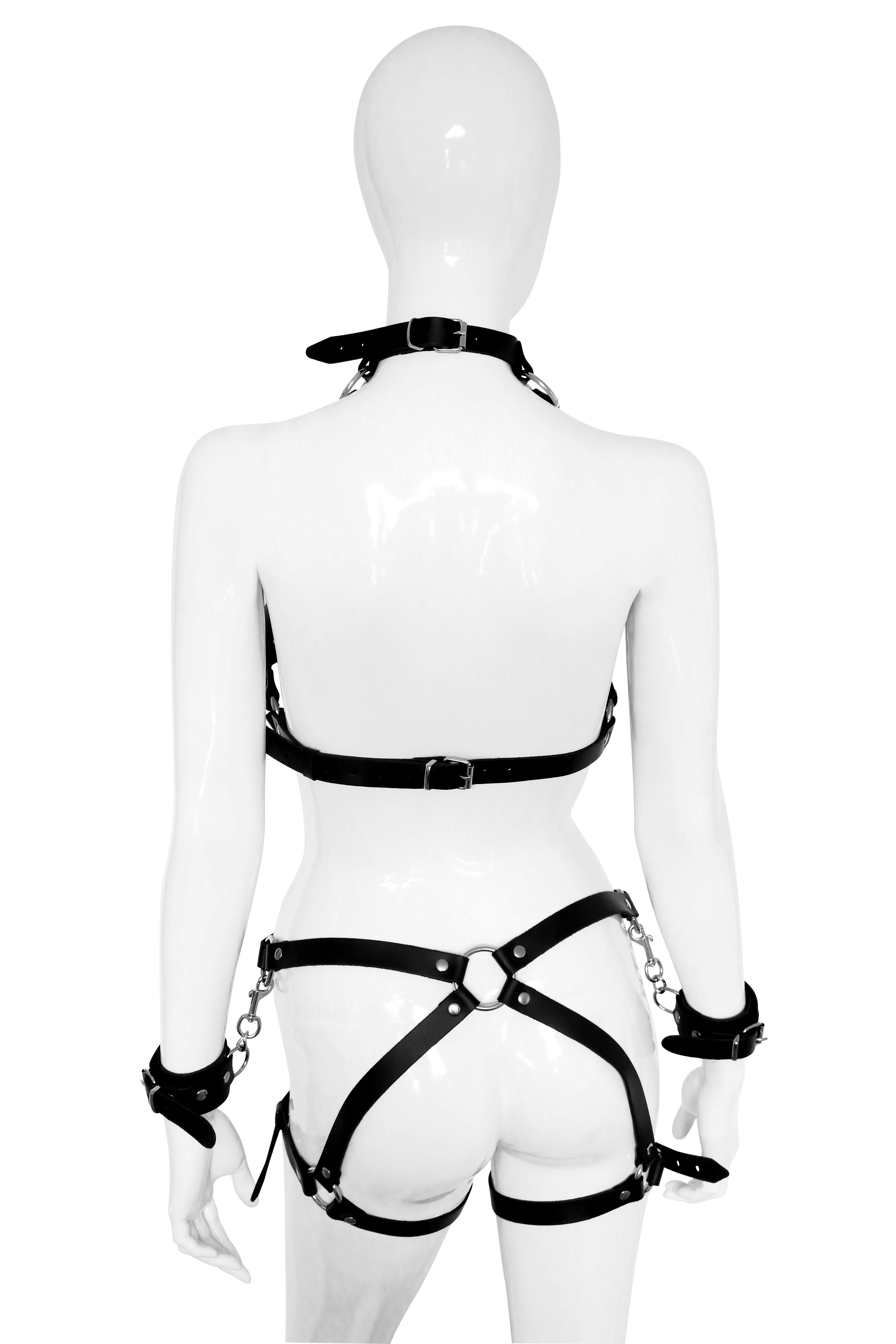 BH sowie Harness aus robusten Leder Riemen mit integrierten(abnehmbaren) Leder Handfssseln