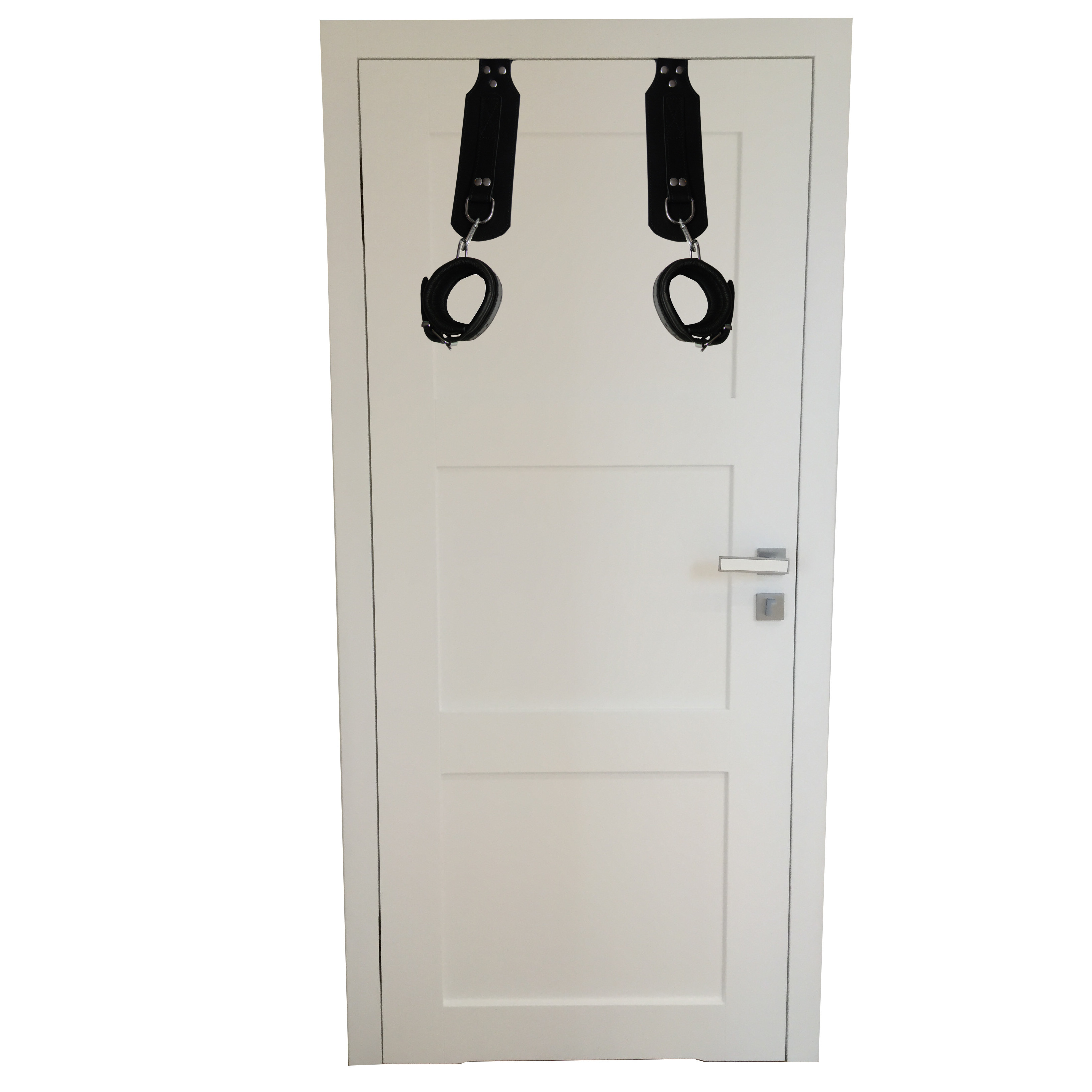 Leder Türaufhängesystem im Türrahmen mit Handfessel Schwarz und Karabiner - Türfessel