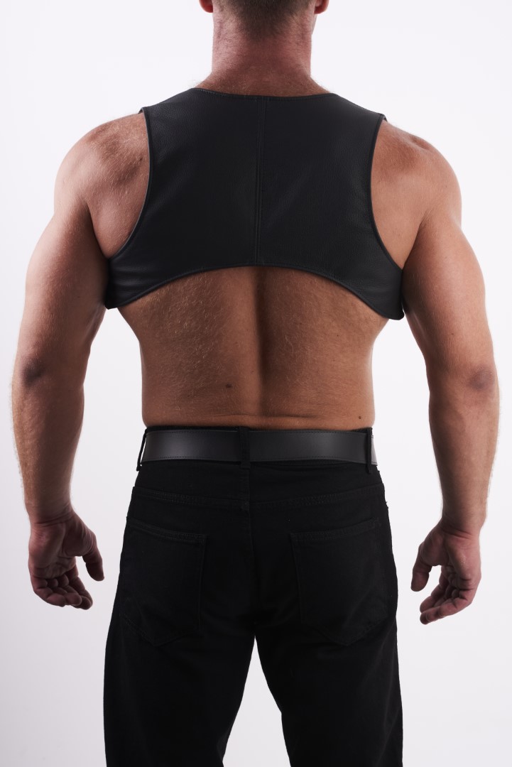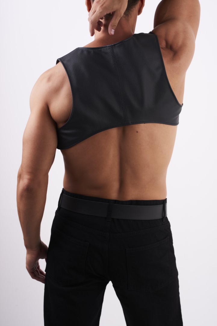 Das feine Leder schmiegt sich perfekt an Deinen heißen Oberkörper und bedeckt Deine Schulterblätter.