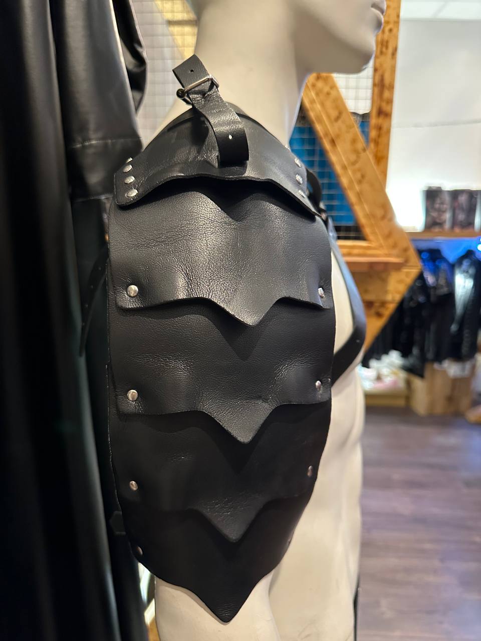 Dieses außergewöhnliche Harness vereint die Ästhetik antiker Kriegsrüstung mit moderner Fetish-Mode. Die mehrlagigen Schulterplatten aus mattem PU-Leder schaffen eine kraftvolle Silhouette, während das Riemenkreuz über Brust und Rücken für einen sicheren, körpernahen Sitz sorgt.