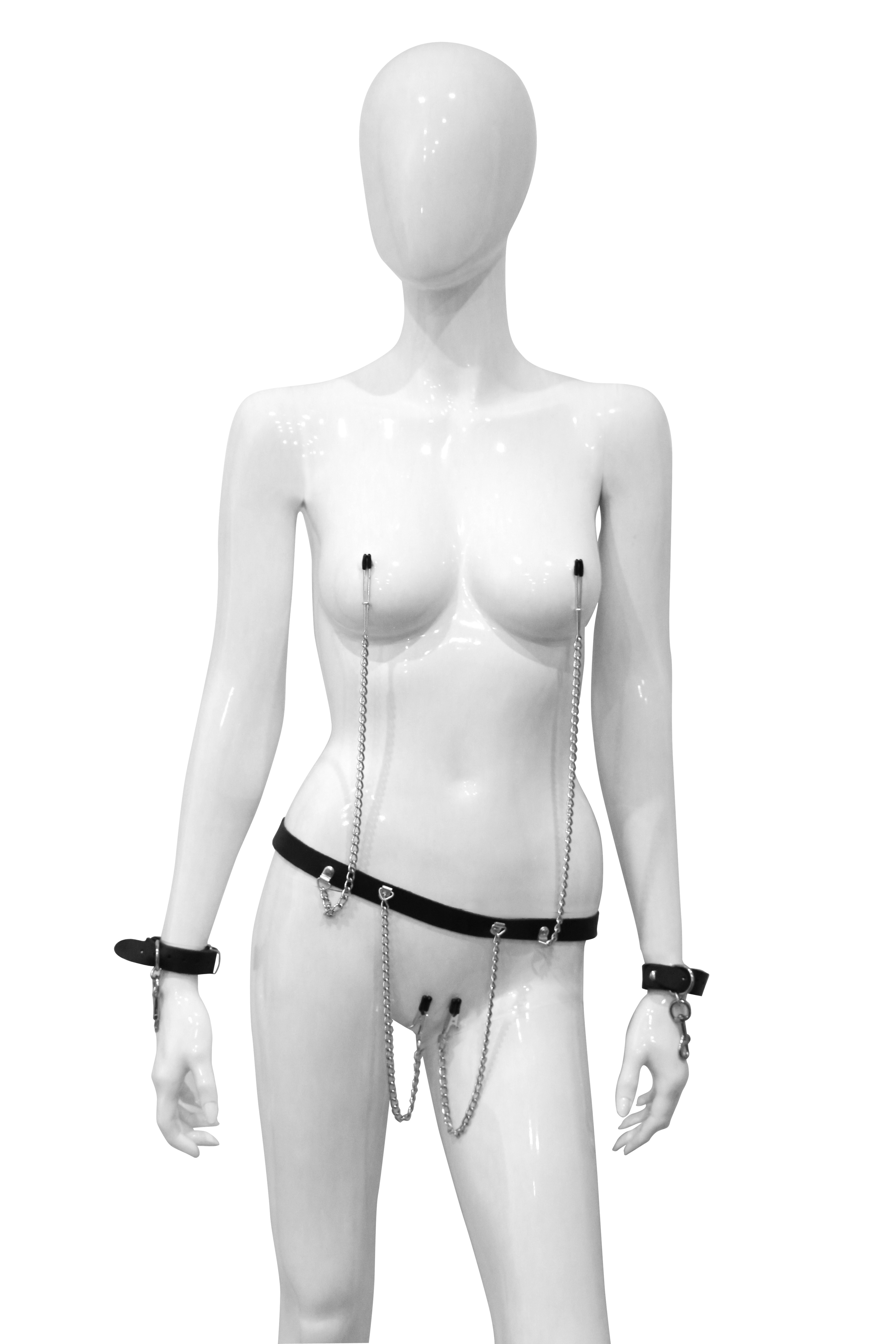 Die Pinzetten sowie Klammern können an den Schamlippen sowie an den Brustwarzen angebracht werden